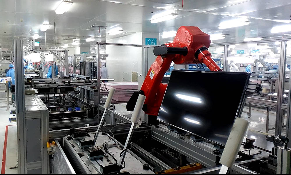 新松先后為海信、創維、TCL等全球多家電視機制造商提供綜合解決方案。主要包括平板電視、曲面電視、無邊框電視的LCD和OLED屏的全自動卡合裝配生產線,及模組變位立直生產線、檢測系統、拆碼垛搬運系統等。