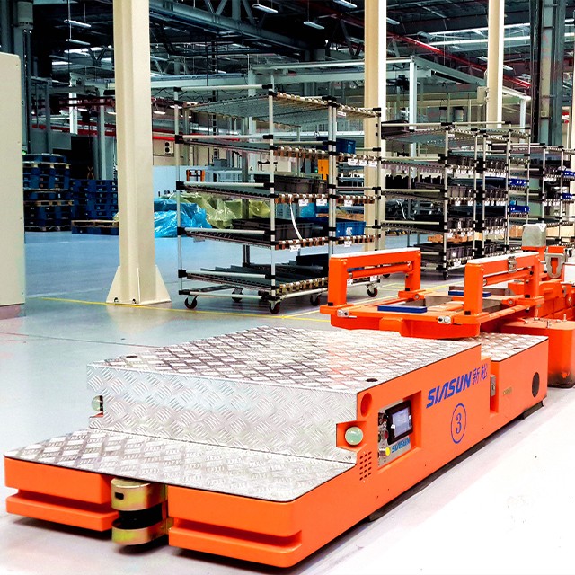 隨著智能制造概念的引入,對汽車生產物流的自動化、柔性化提出了更高的要求。 AGV系統不僅可以完成零件的自動配送,還可以形成自動柔性裝配。新松根據客戶的需求,提供了多種輔助裝配型移動機器人產品,目前在總裝車間的前端模塊分裝工藝、發動機生產分裝工藝、變速箱分裝工藝、內飾線分裝工藝、前橋分裝工藝、后橋分裝工藝;在電池車間的模組生產工藝,pack生產工藝等均有廣泛的應用。
