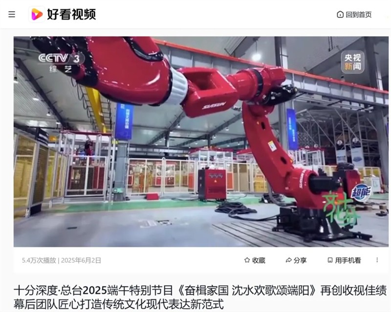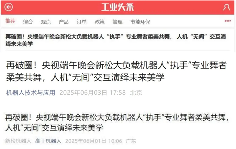 新華社連續刊發《人機“執手”柔美共舞 新松新款大負載工業機器人亮相端午晚會》、《機器人助力幸福生活|這只“變形金剛手臂”成舞林高手》、《在剛結束的2025央視端午晚會上,這只“大手”火了》、《在“大手”機器人上跳舞是什么感覺?》四篇報道,引發全網轉載,累計總閱讀量/點擊量超300萬;人民日報以《剛柔并濟!機器人與演員共舞,演繹未來美學》為題,講述新松在技術創新領域多年深耕,人民網《端午晚會再現人機共舞,這只“大手”來自沈陽新松》,強調新松機器人如何讓科技與藝術完美融合;工人日報則聚焦《晚會上,機器人與專業舞者翩翩起舞》,深挖新松工業機器人SR270A-270/2.70的技術亮點;中國電子報《新松大負載機器人亮相央視端午晚會》,以節目為出發點,全面解讀工業設備如何跨界成為“舞臺藝術家”;遼寧電視臺、遼寧日報、沈陽日報、沈陽晚報等地方媒體三天來針對新松機器人原創刊發超20篇報道,從產品特性、技術創新到地方產業升級等多個角度,深入解讀新松如何代表“東北智造”走向全國,成為中國科技的一張亮麗名片。