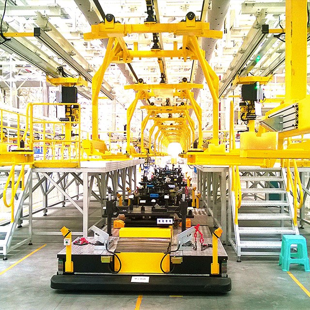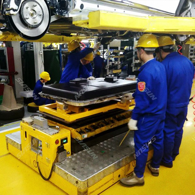 近年來隨著新能源汽車的興起,很多主機廠需要同時生產燃油車和新能源車,對裝配線柔性需求大大提高。新松舉升移動機器人既可以實現電池包與前后懸整體舉升合裝,也可以采用單舉升與雙舉升結合的方式實現電池包與前后懸的分體式合裝。另外為了適應用戶的多樣化需求,新松推出了重載舉升型移動機器人可以實現承載式車身與非承載式車身的混線生產。憑借著多年汽車合裝經驗,我們可以根據客戶的裝配工藝定制解決方案。
