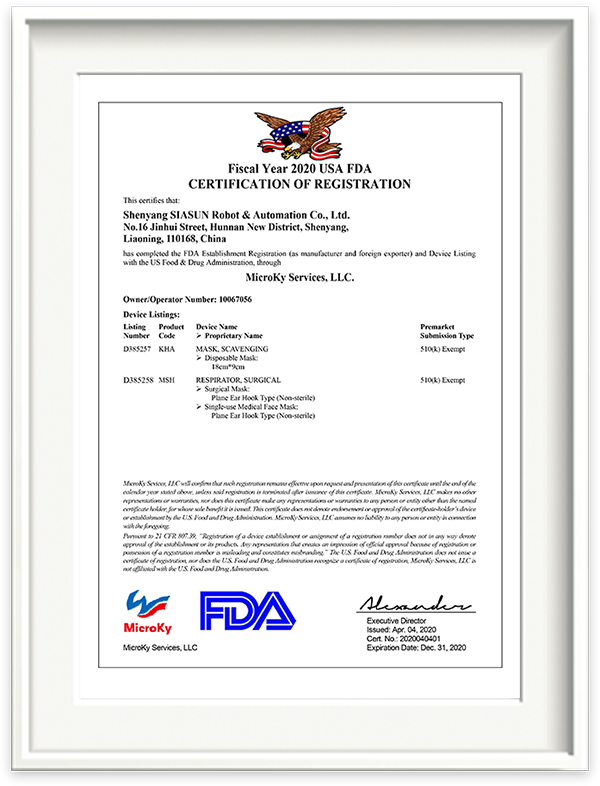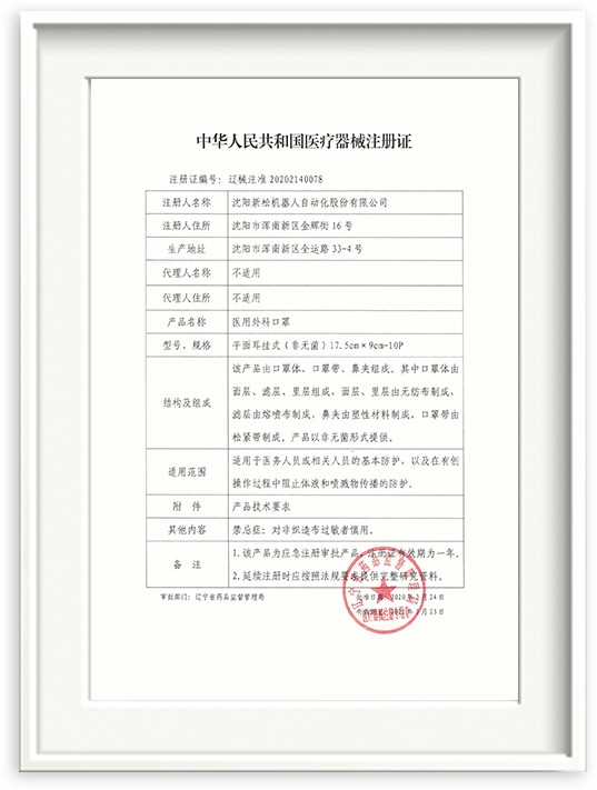 新松嚴(yán)把口罩生產(chǎn)質(zhì)量關(guān),遵守國家相關(guān)標(biāo)準(zhǔn)和品質(zhì)要求,截至目前已經(jīng)通過了一次性使用醫(yī)用口罩、醫(yī)用外科口罩的技術(shù)要求與產(chǎn)品檢驗,取得了醫(yī)療器械生產(chǎn)許可證、一次性使用醫(yī)用口罩注冊證、醫(yī)用外科口罩注冊證。此外,新松自產(chǎn)口罩已通過CE認(rèn)證及FDA認(rèn)證,新松全自動折疊型醫(yī)用防護(hù)口罩生產(chǎn)線也已通過CE認(rèn)證,可勝任多種規(guī)格折疊型口罩的生產(chǎn)工作,為攜手全球各國人民共抗疫情做出努力。
