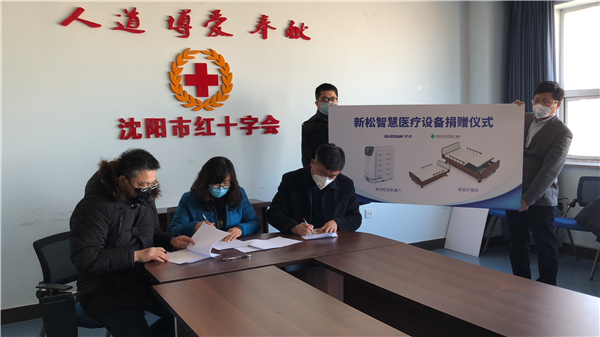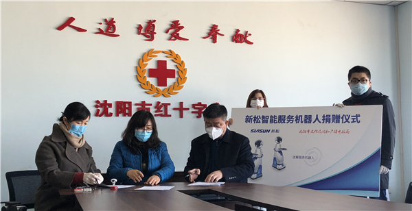 (圖)2月5日,捐贈儀式在沈陽市紅十字會舉辦,醫大一院副院長、工會主席滕偉禹,沈陽市文化旅游和廣播電視局副局長馬今,新松公司副總裁王玉山,沈陽市紅十字會副會長孟麗君共同簽字